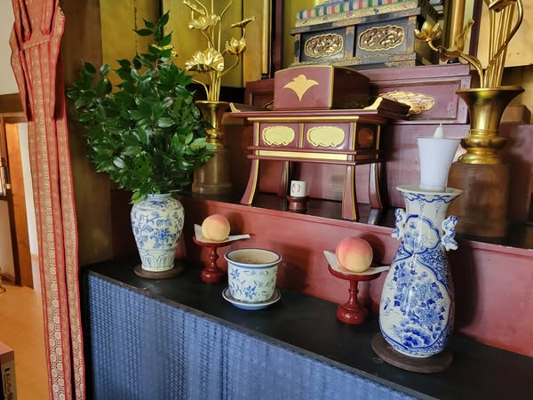 打敷・線香・ロウソク立て・花立ては、夏のブルーバージョンに変わり、朝は涼しい山寺ですが、この日中の猛暑。ご参拝の皆様には厳しい気温です。